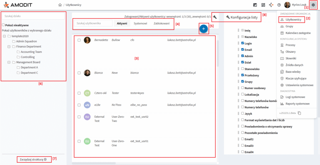• [6] W lewym panelu wyświetlane jest okno struktury organizacyjnej, o ile została zdefiniowana. Kliknięcie na węzeł struktury powoduje przefiltrowanie listy użytkowników dla wskazanego departamentu.