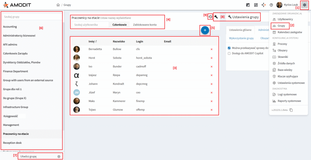 Moduł zarządzania grupami [2] (na poniższym obrazku) dostępny jest w prawym górnym rogu po wybraniu ikony trybiku [1], umożliwiającej przejście do modułów systemowych.