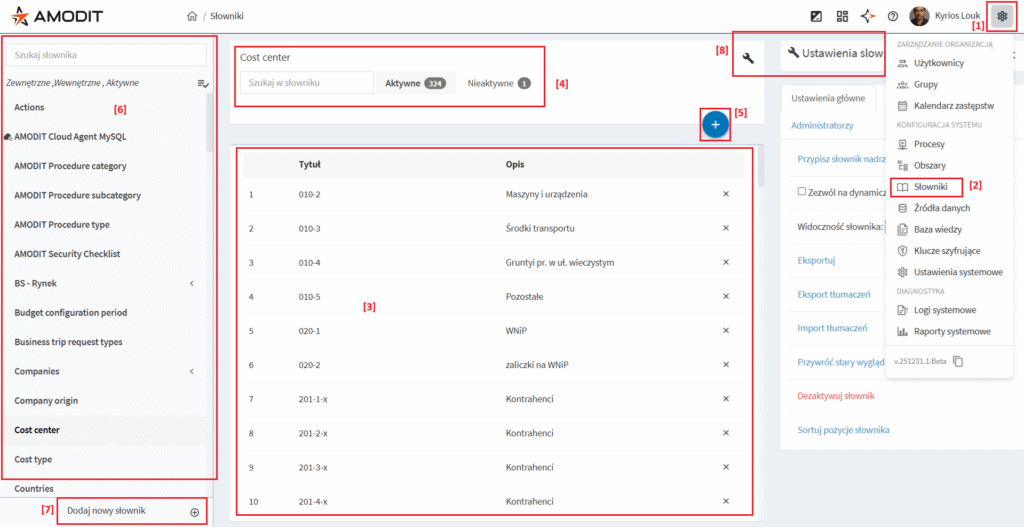 Moduł zarządzania słownikami [2] dostępny jest w prawym górnym rogu po wybraniu ikony trybiku [1], umożliwiającej przejście do modułów systemowych.
