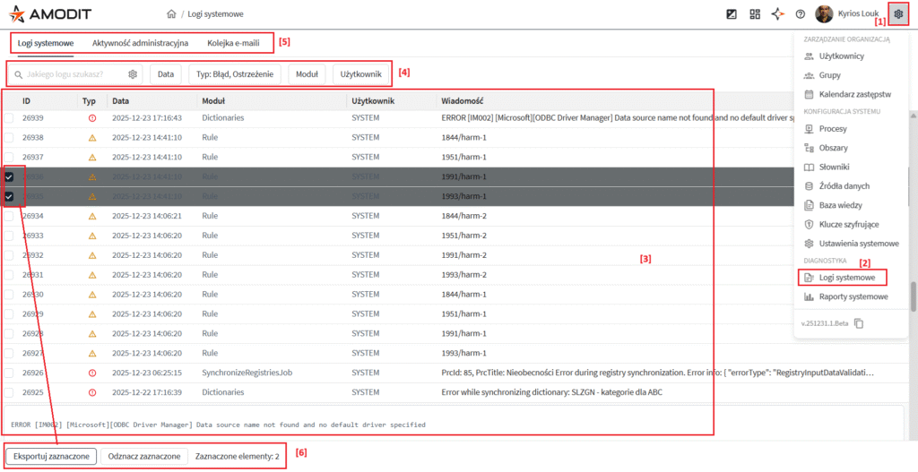 • [3] Lista wpisów do logu systemowego (od najnowszych do najstarszych). Kliknięcie na wiersz ukaże szczegóły wpisu.