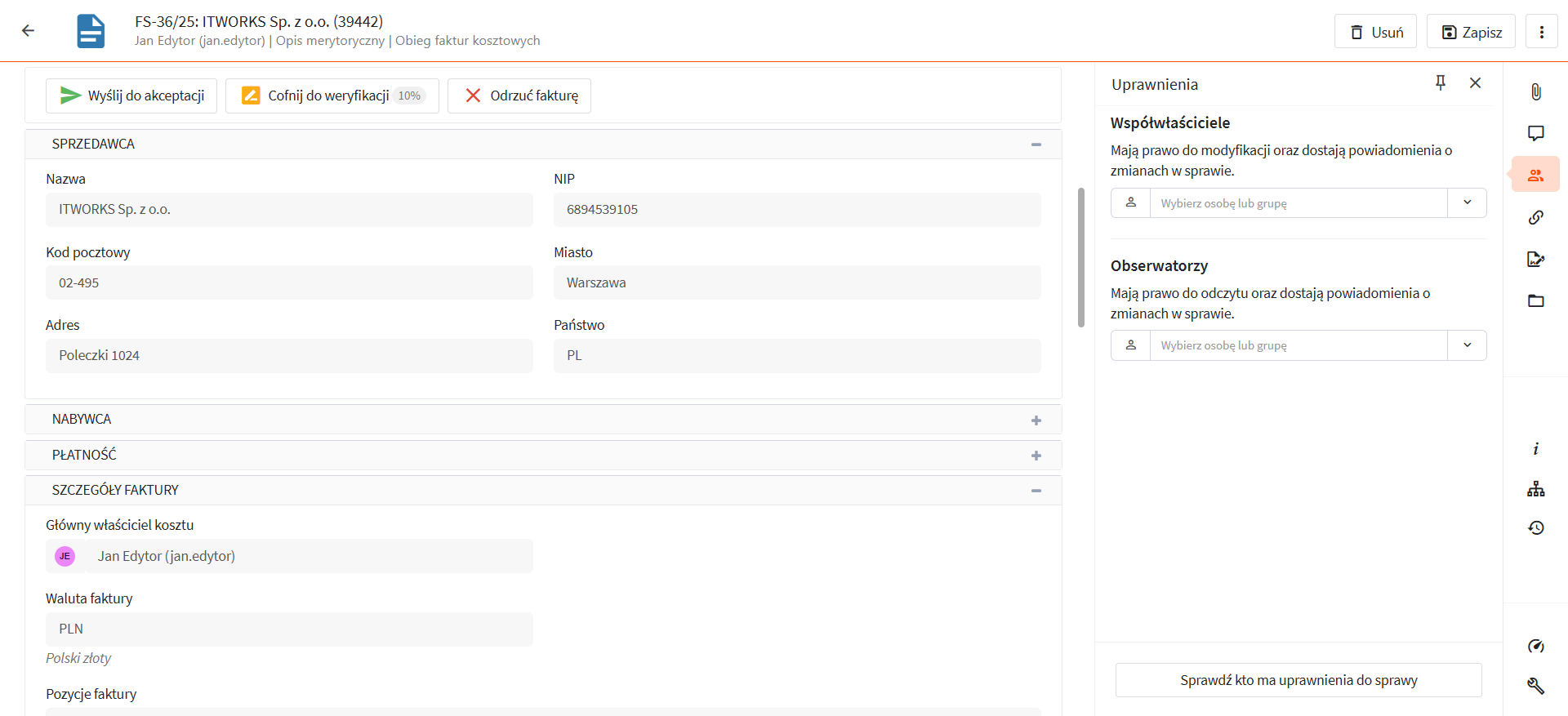 - Nowa zakładka uprawnień – Informacje o uprawnieniach do sprawy przeniesiono do dedykowanego panelu. Administratorzy mogą teraz szybciej i bardziej intuicyjnie sprawdzić szczegóły uprawnień.