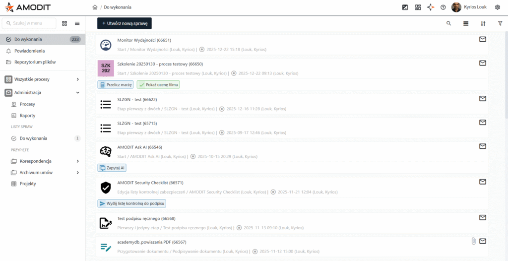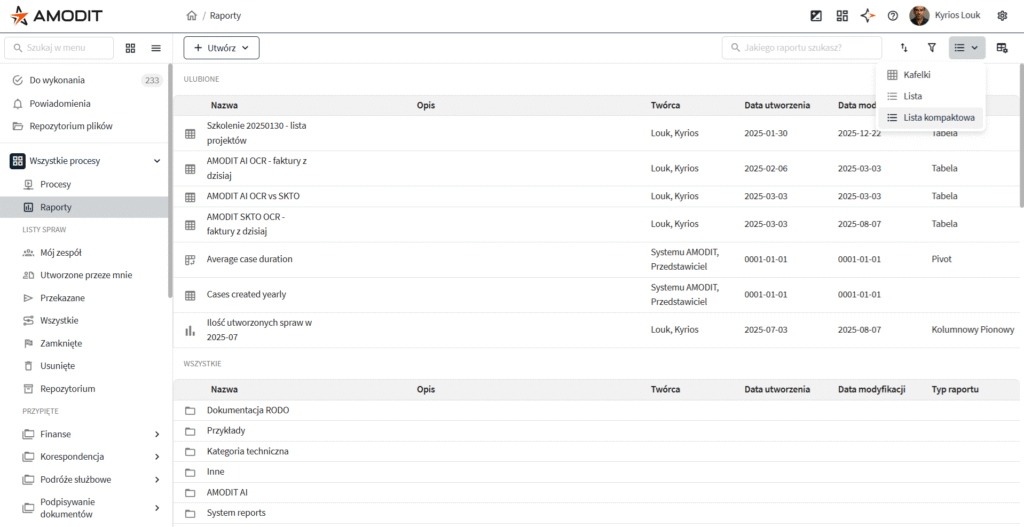 Nowa wersja interfejsu AMODIT porządkuje sposób pracy z systemem. Nie zmienia jego logiki ani funkcjonalności, ale wpływa na to, jak szybko i wygodnie użytkownik porusza się po listach spraw, formularzach i raportach. Sprawdź poniżej najważniejsze zmiany widoczne w interfejsie oraz ich znaczenie w codziennym użytkowaniu.